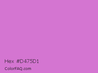 Hex #d475d1 Color is a light magenta color and the nearest color is French Mauve #d473d4. Hex code #d475d1 and RGB value is rgb(212,117,209). In RGB color space, this color is composed of 83% red, 46% green, 82% blue, In CMYK color space, this color is composed of 0% cyan, 45% magenta, 1% yellow , 17% black , In HSL color space, this color has a hue angle of 302° , 52% saturation and 65% lightness.