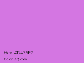 Hex #d476e2 Color is a light magenta color and the nearest color is French Mauve #d473d4. Hex code #d476e2 and RGB value is rgb(212,118,226). In RGB color space, this color is composed of 83% red, 46% green, 89% blue, In CMYK color space, this color is composed of 6% cyan, 48% magenta, 0% yellow , 11% black , In HSL color space, this color has a hue angle of 292° , 65% saturation and 67% lightness.
