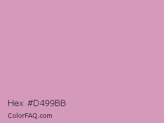 Hex #d499bb Color is a light magenta color and the nearest color is Light Medium Orchid #d39bcb. Hex code #d499bb and RGB value is rgb(212,153,187). In RGB color space, this color is composed of 83% red, 60% green, 73% blue, In CMYK color space, this color is composed of 0% cyan, 28% magenta, 12% yellow , 17% black , In HSL color space, this color has a hue angle of 325° , 41% saturation and 72% lightness.