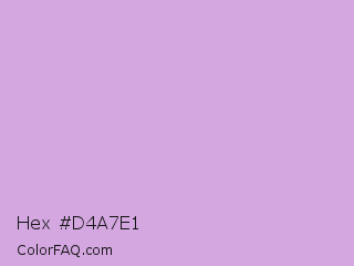 Hex #d4a7e1 Color is a light purple color and the nearest color is Tropical Violet #cda4de. Hex code #d4a7e1 and RGB value is rgb(212,167,225). In RGB color space, this color is composed of 83% red, 65% green, 88% blue, In CMYK color space, this color is composed of 6% cyan, 26% magenta, 0% yellow , 12% black , In HSL color space, this color has a hue angle of 287° , 49% saturation and 77% lightness.