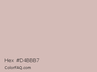 Hex #d4bbb7 Color is a light red color and the nearest color is Cold Turkey #cebaba. Hex code #d4bbb7 and RGB value is rgb(212,187,183). In RGB color space, this color is composed of 83% red, 73% green, 72% blue, In CMYK color space, this color is composed of 0% cyan, 12% magenta, 14% yellow , 17% black , In HSL color space, this color has a hue angle of 8° , 25% saturation and 77% lightness.