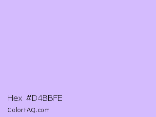 Hex #d4bbfe Color is a very light violet color and the nearest color is Perfume #d0bef8. Hex code #d4bbfe and RGB value is rgb(212,187,254). In RGB color space, this color is composed of 83% red, 73% green, 100% blue, In CMYK color space, this color is composed of 17% cyan, 26% magenta, 0% yellow , 0% black , In HSL color space, this color has a hue angle of 262° , 97% saturation and 86% lightness.