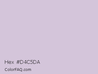Hex #d4c5da Color is a very light purple color and the nearest color is Languid Lavender #d6cadd. Hex code #d4c5da and RGB value is rgb(212,197,218). In RGB color space, this color is composed of 83% red, 77% green, 85% blue, In CMYK color space, this color is composed of 3% cyan, 10% magenta, 0% yellow , 15% black , In HSL color space, this color has a hue angle of 283° , 22% saturation and 81% lightness.