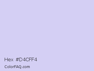 Hex #d4cff4 Color is a very light indigo color and the nearest color is Moon Raker #d6cef6. Hex code #d4cff4 and RGB value is rgb(212,207,244). In RGB color space, this color is composed of 83% red, 81% green, 96% blue, In CMYK color space, this color is composed of 13% cyan, 15% magenta, 0% yellow , 4% black , In HSL color space, this color has a hue angle of 248° , 63% saturation and 88% lightness.