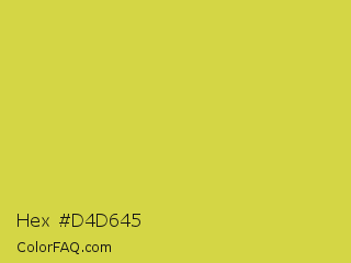 Hex #d4d645 Color is a normal yellow color and the nearest color is Wattle #dcd747. Hex code #d4d645 and RGB value is rgb(212,214,69). In RGB color space, this color is composed of 83% red, 84% green, 27% blue, In CMYK color space, this color is composed of 1% cyan, 0% magenta, 68% yellow , 16% black , In HSL color space, this color has a hue angle of 61° , 64% saturation and 55% lightness.