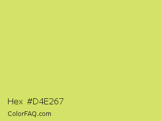 Hex #d4e267 Color is a light yellow color and the nearest color is Booger Buster #dde26a. Hex code #d4e267 and RGB value is rgb(212,226,103). In RGB color space, this color is composed of 83% red, 89% green, 40% blue, In CMYK color space, this color is composed of 6% cyan, 0% magenta, 54% yellow , 11% black , In HSL color space, this color has a hue angle of 67° , 68% saturation and 65% lightness.