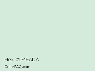 Hex #d4eada Color is a very light green color and the nearest color is Zanah #daecd6. Hex code #d4eada and RGB value is rgb(212,234,218). In RGB color space, this color is composed of 83% red, 92% green, 85% blue, In CMYK color space, this color is composed of 9% cyan, 0% magenta, 7% yellow , 8% black , In HSL color space, this color has a hue angle of 136° , 34% saturation and 87% lightness.