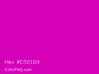 Hex #d501b9 Color is a normal magenta color and the nearest color is Deep Magenta #cc00cc. Hex code #d501b9 and RGB value is rgb(213,1,185). In RGB color space, this color is composed of 84% red, 0% green, 73% blue, In CMYK color space, this color is composed of 0% cyan, 100% magenta, 13% yellow , 16% black , In HSL color space, this color has a hue angle of 308° , 99% saturation and 42% lightness.