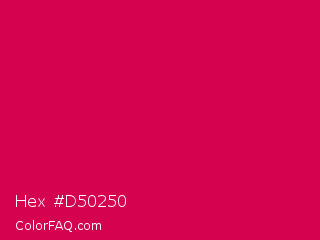 Hex #d50250 Color is a normal rose color and the nearest color is UA Red #d9004c. Hex code #d50250 and RGB value is rgb(213,2,80). In RGB color space, this color is composed of 84% red, 1% green, 31% blue, In CMYK color space, this color is composed of 0% cyan, 99% magenta, 62% yellow , 16% black , In HSL color space, this color has a hue angle of 338° , 98% saturation and 42% lightness.