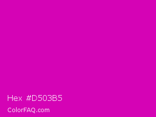 Hex #d503b5 Color is a normal magenta color and the nearest color is Deep Magenta #cc00cc. Hex code #d503b5 and RGB value is rgb(213,3,181). In RGB color space, this color is composed of 84% red, 1% green, 71% blue, In CMYK color space, this color is composed of 0% cyan, 99% magenta, 15% yellow , 16% black , In HSL color space, this color has a hue angle of 309° , 97% saturation and 42% lightness.