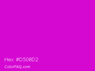 Hex #d508d2 Color is a normal magenta color and the nearest color is Deep Magenta #cc00cc. Hex code #d508d2 and RGB value is rgb(213,8,210). In RGB color space, this color is composed of 84% red, 3% green, 82% blue, In CMYK color space, this color is composed of 0% cyan, 96% magenta, 1% yellow , 16% black , In HSL color space, this color has a hue angle of 301° , 93% saturation and 43% lightness.