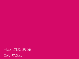 Hex #d50968 Color is a normal rose color and the nearest color is Dogwood Rose #d71868. Hex code #d50968 and RGB value is rgb(213,9,104). In RGB color space, this color is composed of 84% red, 4% green, 41% blue, In CMYK color space, this color is composed of 0% cyan, 96% magenta, 51% yellow , 16% black , In HSL color space, this color has a hue angle of 332° , 92% saturation and 44% lightness.