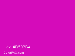 Hex #d50bba Color is a normal magenta color and the nearest color is Deep Magenta #cc00cc. Hex code #d50bba and RGB value is rgb(213,11,186). In RGB color space, this color is composed of 84% red, 4% green, 73% blue, In CMYK color space, this color is composed of 0% cyan, 95% magenta, 13% yellow , 16% black , In HSL color space, this color has a hue angle of 308° , 90% saturation and 44% lightness.