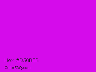 Hex #d50beb Color is a normal magenta color and the nearest color is Vivid Orchid #cc00ff. Hex code #d50beb and RGB value is rgb(213,11,235). In RGB color space, this color is composed of 84% red, 4% green, 92% blue, In CMYK color space, this color is composed of 9% cyan, 95% magenta, 0% yellow , 8% black , In HSL color space, this color has a hue angle of 294° , 91% saturation and 48% lightness.