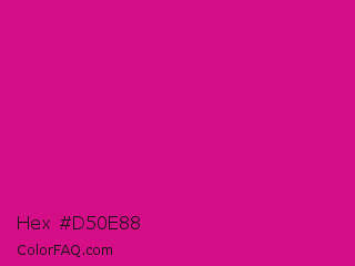 Hex #d50e88 Color is a normal magenta color and the nearest color is Red Violet #c71585. Hex code #d50e88 and RGB value is rgb(213,14,136). In RGB color space, this color is composed of 84% red, 5% green, 53% blue, In CMYK color space, this color is composed of 0% cyan, 93% magenta, 36% yellow , 16% black , In HSL color space, this color has a hue angle of 323° , 88% saturation and 45% lightness.