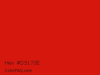 Hex #d5170e Color is a normal red color and the nearest color is Lava #cf1020. Hex code #d5170e and RGB value is rgb(213,23,14). In RGB color space, this color is composed of 84% red, 9% green, 5% blue, In CMYK color space, this color is composed of 0% cyan, 89% magenta, 93% yellow , 16% black , In HSL color space, this color has a hue angle of 3° , 88% saturation and 45% lightness.