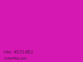 Hex #d518b2 Color is a normal magenta color and the nearest color is Deep Magenta #cc00cc. Hex code #d518b2 and RGB value is rgb(213,24,178). In RGB color space, this color is composed of 84% red, 9% green, 70% blue, In CMYK color space, this color is composed of 0% cyan, 89% magenta, 16% yellow , 16% black , In HSL color space, this color has a hue angle of 311° , 80% saturation and 46% lightness.