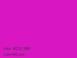 Hex #d519bf Color is a normal magenta color and the nearest color is Deep Magenta #cc00cc. Hex code #d519bf and RGB value is rgb(213,25,191). In RGB color space, this color is composed of 84% red, 10% green, 75% blue, In CMYK color space, this color is composed of 0% cyan, 88% magenta, 10% yellow , 16% black , In HSL color space, this color has a hue angle of 307° , 79% saturation and 47% lightness.
