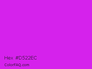Hex #d522ec Color is a normal magenta color and the nearest color is Steel Pink #cc33cc. Hex code #d522ec and RGB value is rgb(213,34,236). In RGB color space, this color is composed of 84% red, 13% green, 93% blue, In CMYK color space, this color is composed of 10% cyan, 86% magenta, 0% yellow , 7% black , In HSL color space, this color has a hue angle of 293° , 84% saturation and 53% lightness.