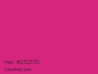 Hex #d5257d Color is a normal rose color and the nearest color is Vivid Cerise #da1d81. Hex code #d5257d and RGB value is rgb(213,37,125). In RGB color space, this color is composed of 84% red, 15% green, 49% blue, In CMYK color space, this color is composed of 0% cyan, 83% magenta, 41% yellow , 16% black , In HSL color space, this color has a hue angle of 330° , 70% saturation and 49% lightness.