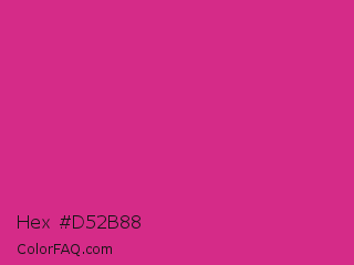 Hex #d52b88 Color is a normal magenta color and the nearest color is Cerise #da3287. Hex code #d52b88 and RGB value is rgb(213,43,136). In RGB color space, this color is composed of 84% red, 17% green, 53% blue, In CMYK color space, this color is composed of 0% cyan, 80% magenta, 36% yellow , 16% black , In HSL color space, this color has a hue angle of 327° , 67% saturation and 50% lightness.