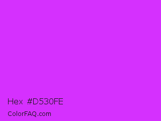 Hex #d530fe Color is a normal purple color and the nearest color is Vivid Orchid #cc00ff. Hex code #d530fe and RGB value is rgb(213,48,254). In RGB color space, this color is composed of 84% red, 19% green, 100% blue, In CMYK color space, this color is composed of 16% cyan, 81% magenta, 0% yellow , 0% black , In HSL color space, this color has a hue angle of 288° , 99% saturation and 59% lightness.