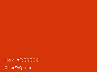 Hex #d53509 Color is a normal red color and the nearest color is Sinopia #cb410b. Hex code #d53509 and RGB value is rgb(213,53,9). In RGB color space, this color is composed of 84% red, 21% green, 4% blue, In CMYK color space, this color is composed of 0% cyan, 75% magenta, 96% yellow , 16% black , In HSL color space, this color has a hue angle of 13° , 92% saturation and 44% lightness.