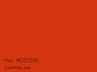 Hex #d5350e Color is a normal red color and the nearest color is Sinopia #cb410b. Hex code #d5350e and RGB value is rgb(213,53,14). In RGB color space, this color is composed of 84% red, 21% green, 5% blue, In CMYK color space, this color is composed of 0% cyan, 75% magenta, 93% yellow , 16% black , In HSL color space, this color has a hue angle of 12° , 88% saturation and 45% lightness.