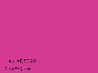 Hex #d53991 Color is a normal magenta color and the nearest color is Magenta Pink #cc338b. Hex code #d53991 and RGB value is rgb(213,57,145). In RGB color space, this color is composed of 84% red, 22% green, 57% blue, In CMYK color space, this color is composed of 0% cyan, 73% magenta, 32% yellow , 16% black , In HSL color space, this color has a hue angle of 326° , 65% saturation and 53% lightness.