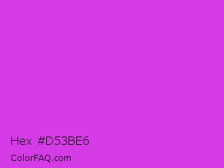 Hex #d53be6 Color is a normal magenta color and the nearest color is Steel Pink #cc33cc. Hex code #d53be6 and RGB value is rgb(213,59,230). In RGB color space, this color is composed of 84% red, 23% green, 90% blue, In CMYK color space, this color is composed of 7% cyan, 74% magenta, 0% yellow , 10% black , In HSL color space, this color has a hue angle of 294° , 77% saturation and 57% lightness.