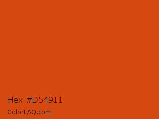 Hex #d54911 Color is a normal orange color and the nearest color is Sinopia #cb410b. Hex code #d54911 and RGB value is rgb(213,73,17). In RGB color space, this color is composed of 84% red, 29% green, 7% blue, In CMYK color space, this color is composed of 0% cyan, 66% magenta, 92% yellow , 16% black , In HSL color space, this color has a hue angle of 17° , 85% saturation and 45% lightness.
