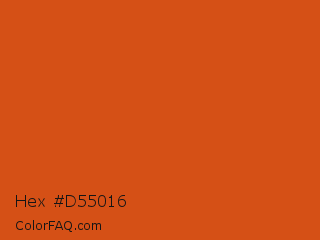 Hex #d55016 Color is a normal orange color and the nearest color is Orange Roughy #c45719. Hex code #d55016 and RGB value is rgb(213,80,22). In RGB color space, this color is composed of 84% red, 31% green, 9% blue, In CMYK color space, this color is composed of 0% cyan, 62% magenta, 90% yellow , 16% black , In HSL color space, this color has a hue angle of 18° , 81% saturation and 46% lightness.