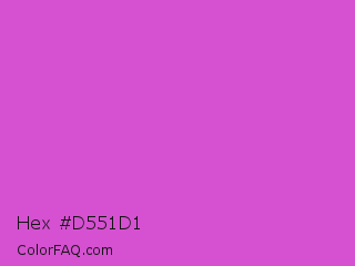 Hex #d551d1 Color is a normal magenta color and the nearest color is Fuchsia Pink #c154c1. Hex code #d551d1 and RGB value is rgb(213,81,209). In RGB color space, this color is composed of 84% red, 32% green, 82% blue, In CMYK color space, this color is composed of 0% cyan, 62% magenta, 2% yellow , 16% black , In HSL color space, this color has a hue angle of 302° , 61% saturation and 58% lightness.
