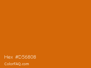 Hex #d56808 Color is a normal orange color and the nearest color is Bamboo #da6304. Hex code #d56808 and RGB value is rgb(213,104,8). In RGB color space, this color is composed of 84% red, 41% green, 3% blue, In CMYK color space, this color is composed of 0% cyan, 51% magenta, 96% yellow , 16% black , In HSL color space, this color has a hue angle of 28° , 93% saturation and 43% lightness.