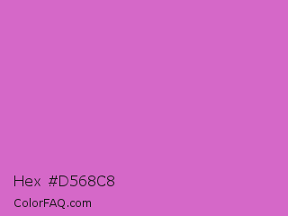 Hex #d568c8 Color is a light magenta color and the nearest color is French Mauve #d473d4. Hex code #d568c8 and RGB value is rgb(213,104,200). In RGB color space, this color is composed of 84% red, 41% green, 78% blue, In CMYK color space, this color is composed of 0% cyan, 51% magenta, 6% yellow , 16% black , In HSL color space, this color has a hue angle of 307° , 56% saturation and 62% lightness.
