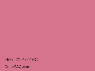 Hex #d5748c Color is a light red color and the nearest color is Charm #d47494. Hex code #d5748c and RGB value is rgb(213,116,140). In RGB color space, this color is composed of 84% red, 45% green, 55% blue, In CMYK color space, this color is composed of 0% cyan, 46% magenta, 34% yellow , 16% black , In HSL color space, this color has a hue angle of 345° , 54% saturation and 65% lightness.