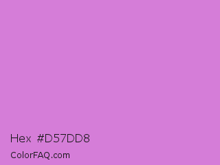Hex #d57dd8 Color is a light magenta color and the nearest color is French Mauve #d473d4. Hex code #d57dd8 and RGB value is rgb(213,125,216). In RGB color space, this color is composed of 84% red, 49% green, 85% blue, In CMYK color space, this color is composed of 1% cyan, 42% magenta, 0% yellow , 15% black , In HSL color space, this color has a hue angle of 298° , 54% saturation and 67% lightness.