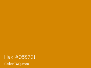 Hex #d58701 Color is a normal orange color and the nearest color is Harvest Gold #da9100. Hex code #d58701 and RGB value is rgb(213,135,1). In RGB color space, this color is composed of 84% red, 53% green, 0% blue, In CMYK color space, this color is composed of 0% cyan, 37% magenta, 100% yellow , 16% black , In HSL color space, this color has a hue angle of 38° , 99% saturation and 42% lightness.