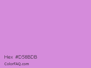 Hex #d58bdb Color is a light magenta color and the nearest color is Bright Lilac #d891ef. Hex code #d58bdb and RGB value is rgb(213,139,219). In RGB color space, this color is composed of 84% red, 55% green, 86% blue, In CMYK color space, this color is composed of 3% cyan, 37% magenta, 0% yellow , 14% black , In HSL color space, this color has a hue angle of 296° , 53% saturation and 70% lightness.