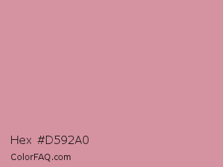 Hex #d592a0 Color is a light red color and the nearest color is Can Can #d591a4. Hex code #d592a0 and RGB value is rgb(213,146,160). In RGB color space, this color is composed of 84% red, 57% green, 63% blue, In CMYK color space, this color is composed of 0% cyan, 31% magenta, 25% yellow , 16% black , In HSL color space, this color has a hue angle of 347° , 44% saturation and 70% lightness.