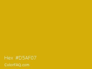Hex #d5af07 Color is a normal yellow color and the nearest color is Galliano #dcb20c. Hex code #d5af07 and RGB value is rgb(213,175,7). In RGB color space, this color is composed of 84% red, 69% green, 3% blue, In CMYK color space, this color is composed of 0% cyan, 18% magenta, 97% yellow , 16% black , In HSL color space, this color has a hue angle of 49° , 94% saturation and 43% lightness.