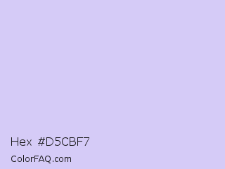 Hex #d5cbf7 Color is a very light indigo color and the nearest color is Moon Raker #d6cef6. Hex code #d5cbf7 and RGB value is rgb(213,203,247). In RGB color space, this color is composed of 84% red, 80% green, 97% blue, In CMYK color space, this color is composed of 14% cyan, 18% magenta, 0% yellow , 3% black , In HSL color space, this color has a hue angle of 254° , 73% saturation and 88% lightness.
