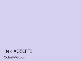Hex #d5cff0 Color is a very light indigo color and the nearest color is Moon Raker #d6cef6. Hex code #d5cff0 and RGB value is rgb(213,207,240). In RGB color space, this color is composed of 84% red, 81% green, 94% blue, In CMYK color space, this color is composed of 11% cyan, 14% magenta, 0% yellow , 6% black , In HSL color space, this color has a hue angle of 251° , 52% saturation and 88% lightness.