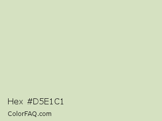 Hex #d5e1c1 Color is a very light green color and the nearest color is Tana #d9dcc1. Hex code #d5e1c1 and RGB value is rgb(213,225,193). In RGB color space, this color is composed of 84% red, 88% green, 76% blue, In CMYK color space, this color is composed of 5% cyan, 0% magenta, 14% yellow , 12% black , In HSL color space, this color has a hue angle of 83° , 35% saturation and 82% lightness.