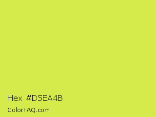 Hex #d5ea4b Color is a light yellow color and the nearest color is Maximum Green Yellow #d9e650. Hex code #d5ea4b and RGB value is rgb(213,234,75). In RGB color space, this color is composed of 84% red, 92% green, 29% blue, In CMYK color space, this color is composed of 9% cyan, 0% magenta, 68% yellow , 8% black , In HSL color space, this color has a hue angle of 68° , 79% saturation and 61% lightness.