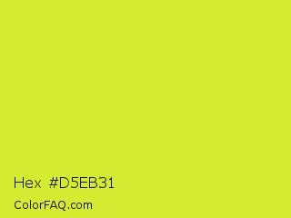 Hex #d5eb31 Color is a normal yellow color and the nearest color is Pear #d1e231. Hex code #d5eb31 and RGB value is rgb(213,235,49). In RGB color space, this color is composed of 84% red, 92% green, 19% blue, In CMYK color space, this color is composed of 9% cyan, 0% magenta, 79% yellow , 8% black , In HSL color space, this color has a hue angle of 67° , 82% saturation and 56% lightness.