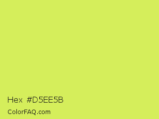 Hex #d5ee5b Color is a light yellow color and the nearest color is Maximum Green Yellow #d9e650. Hex code #d5ee5b and RGB value is rgb(213,238,91). In RGB color space, this color is composed of 84% red, 93% green, 36% blue, In CMYK color space, this color is composed of 11% cyan, 0% magenta, 62% yellow , 7% black , In HSL color space, this color has a hue angle of 70° , 81% saturation and 65% lightness.