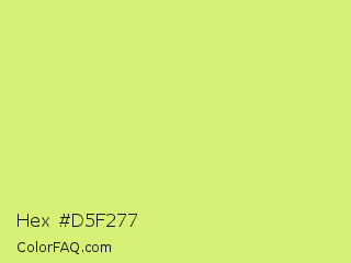 Hex #d5f277 Color is a light lime color and the nearest color is Sulu #c1f07c. Hex code #d5f277 and RGB value is rgb(213,242,119). In RGB color space, this color is composed of 84% red, 95% green, 47% blue, In CMYK color space, this color is composed of 12% cyan, 0% magenta, 51% yellow , 5% black , In HSL color space, this color has a hue angle of 74° , 83% saturation and 71% lightness.