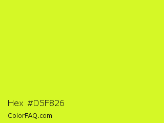 Hex #d5f826 Color is a normal yellow color and the nearest color is Arctic Lime #d0ff14. Hex code #d5f826 and RGB value is rgb(213,248,38). In RGB color space, this color is composed of 84% red, 97% green, 15% blue, In CMYK color space, this color is composed of 14% cyan, 0% magenta, 85% yellow , 3% black , In HSL color space, this color has a hue angle of 70° , 94% saturation and 56% lightness.