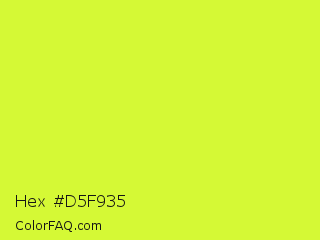 Hex #d5f935 Color is a normal lime color and the nearest color is Pear #d1e231. Hex code #d5f935 and RGB value is rgb(213,249,53). In RGB color space, this color is composed of 84% red, 98% green, 21% blue, In CMYK color space, this color is composed of 14% cyan, 0% magenta, 79% yellow , 2% black , In HSL color space, this color has a hue angle of 71° , 94% saturation and 59% lightness.